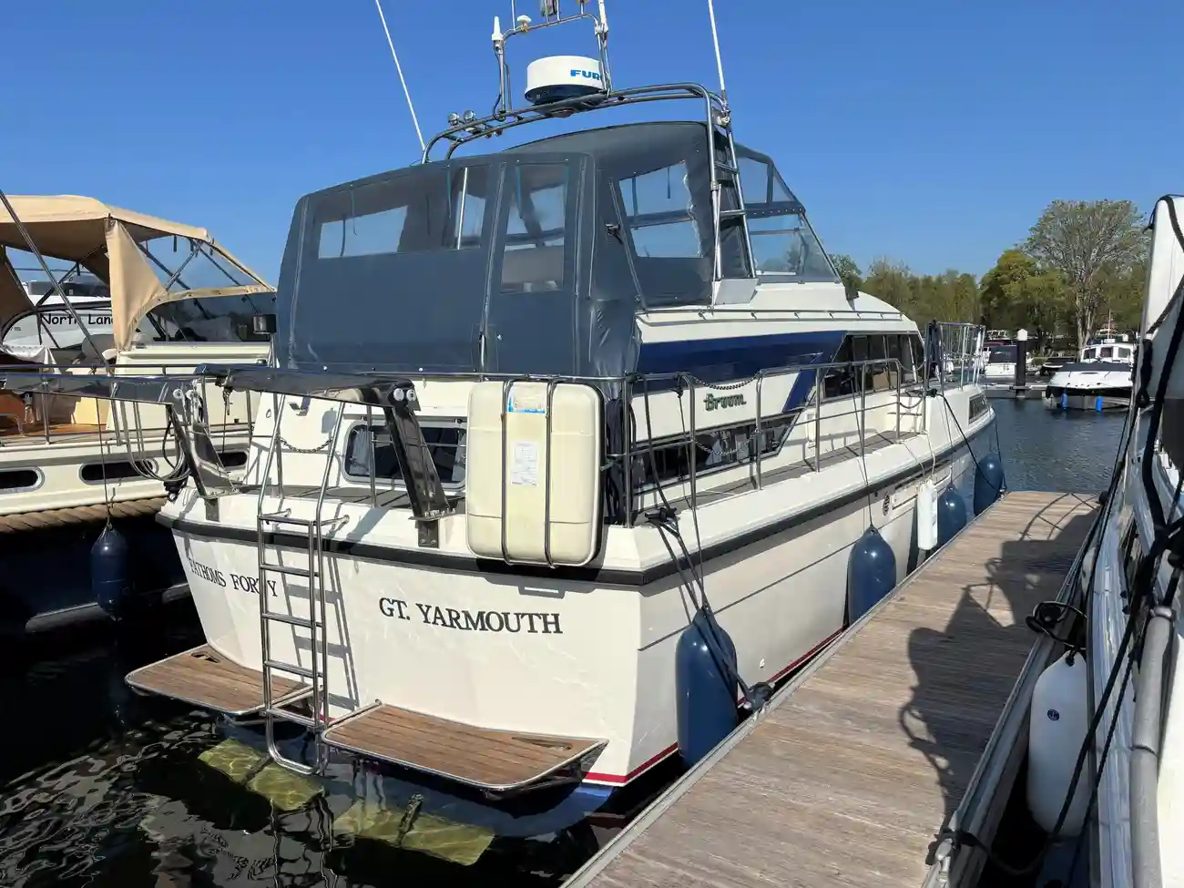 This Broom Monarch is powered by twin Volvo Penta TAMD61A engines. Designed to accommodate up to four guests across three well-appointed cabins, the Monarch offers ample space for relaxation and enjoyment, making it an ideal choice for family getaways or weekend trips with friends.