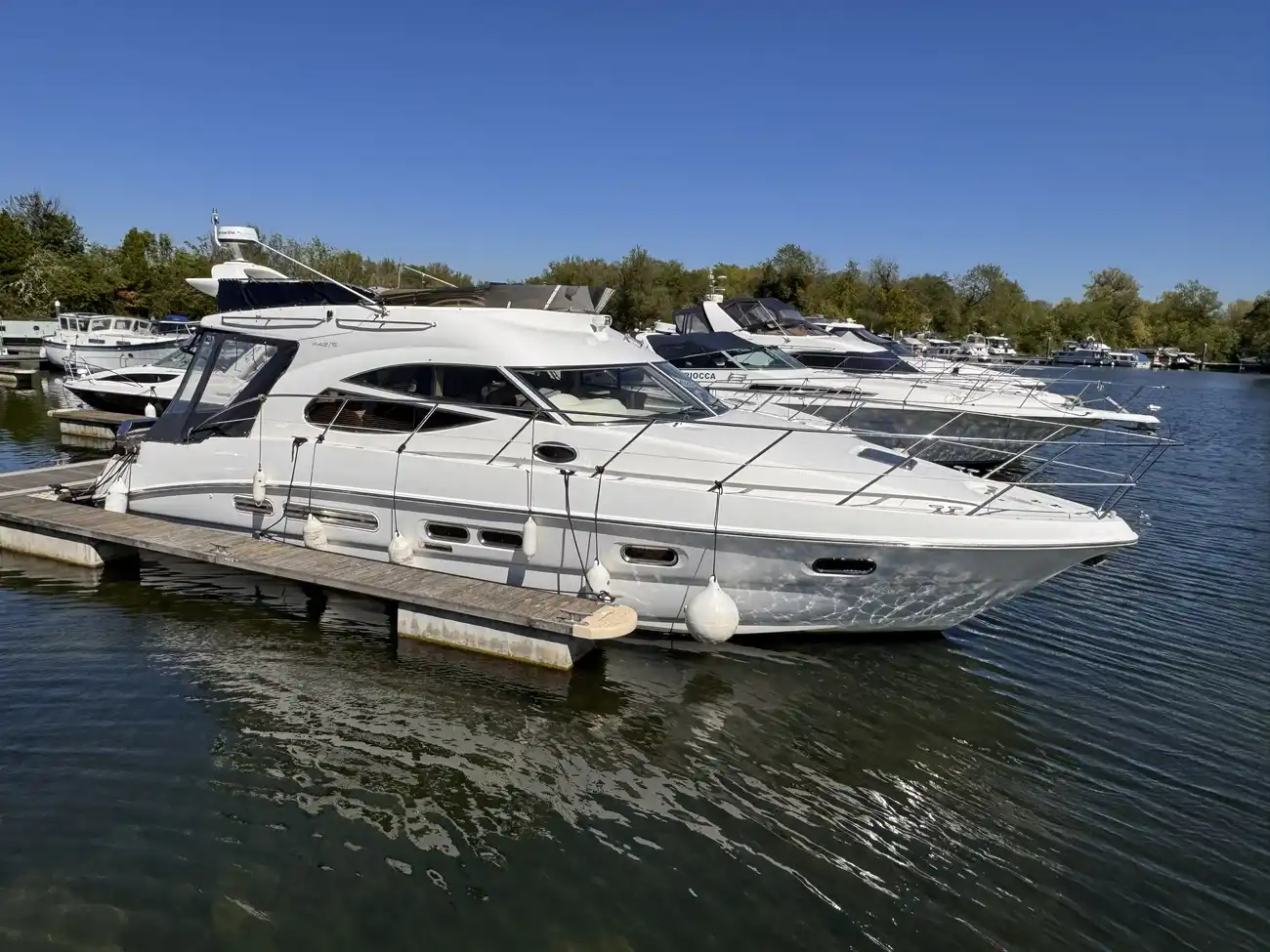 Epiphany II is a nice example of these popular cruisers. This Sealine F42/5 has a hydraulic folding radar arch at the touch of a button enabling her to be used on the Thames. She has a roomy layout with a great flybridge and cockpit which extends. Viewing highly recommended.