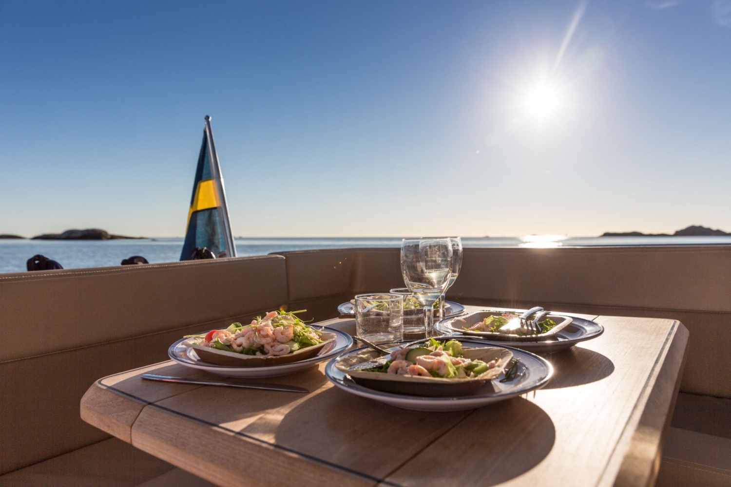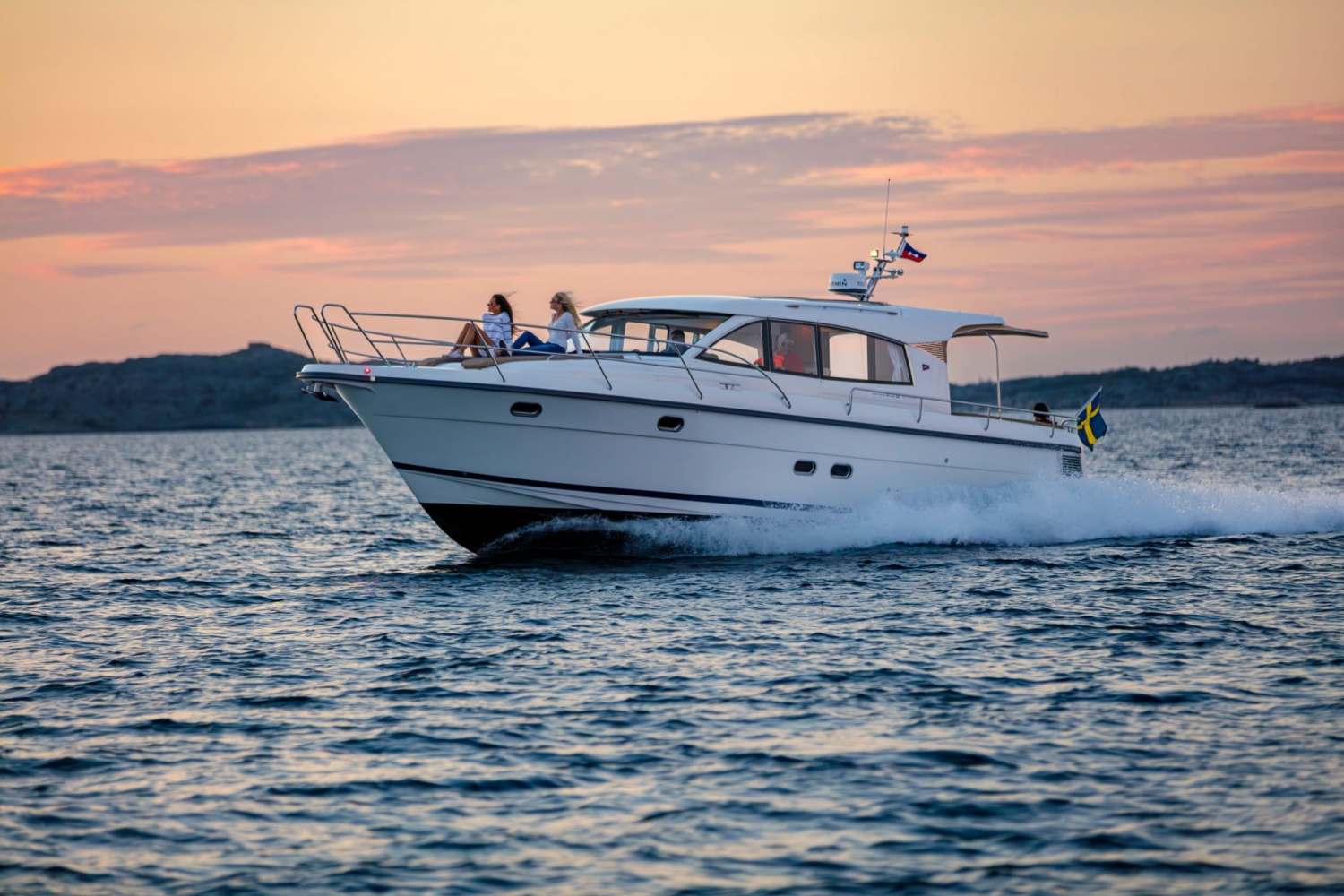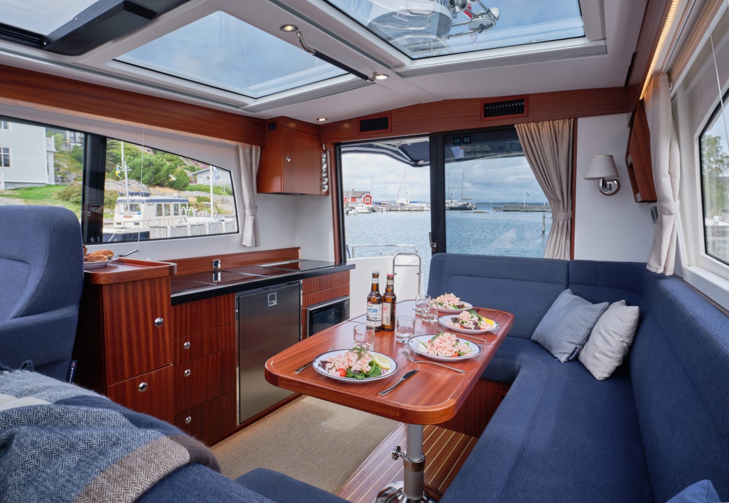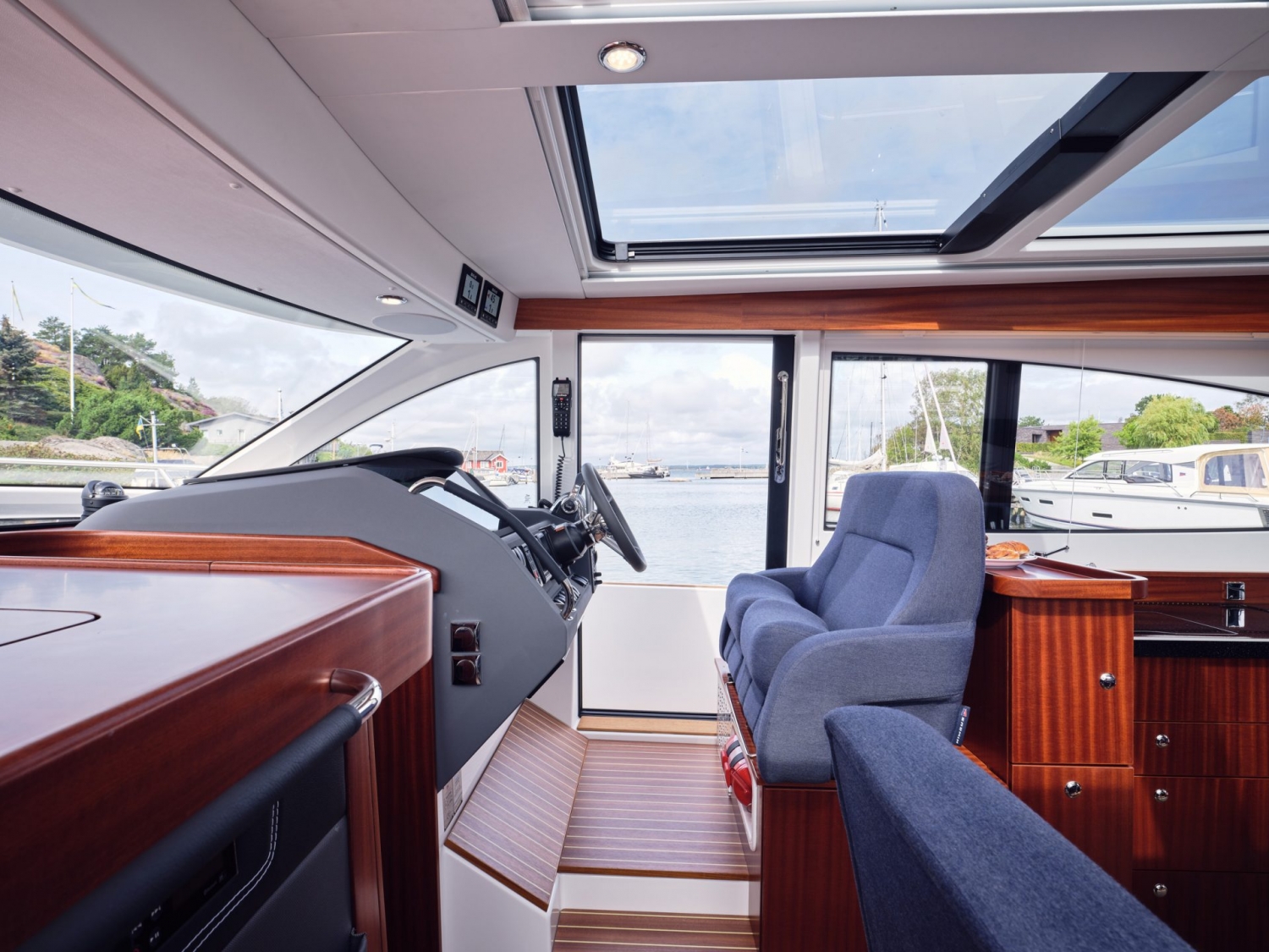 The boat has many similarities to her smaller sisters but offers several new features. The Nimbus Design Team has added several interesting aesthetic and functionally integrated details. These include twin touch screens at the helm, room for five to ride facing forward, a new D-pillar with integrated ventilation, fully glazed aft deck door, electric powered table on the aft deck and a "granny hatch” that conceals a main power plug on the stern. Other innovations include newly designed engine room ventilation in the hull sides with powered extractors, galley with ceramic gas hob and dark composite worktop, 120-liter capacity fridge plus extra cool storage in pull-out drawers beneath the salon sofa and much more.